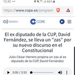 - David Fernàndez retwitteóLa Junta Electoral Central ha asumido ahora el papel de mamporrero contra el independentismo, saltándose la Constitución y las leyes. No se dan cuenta de que están destruyendo el régimen de elecciones libres. Para hundir a Puigdemont hunden todo el sistema democrático.
